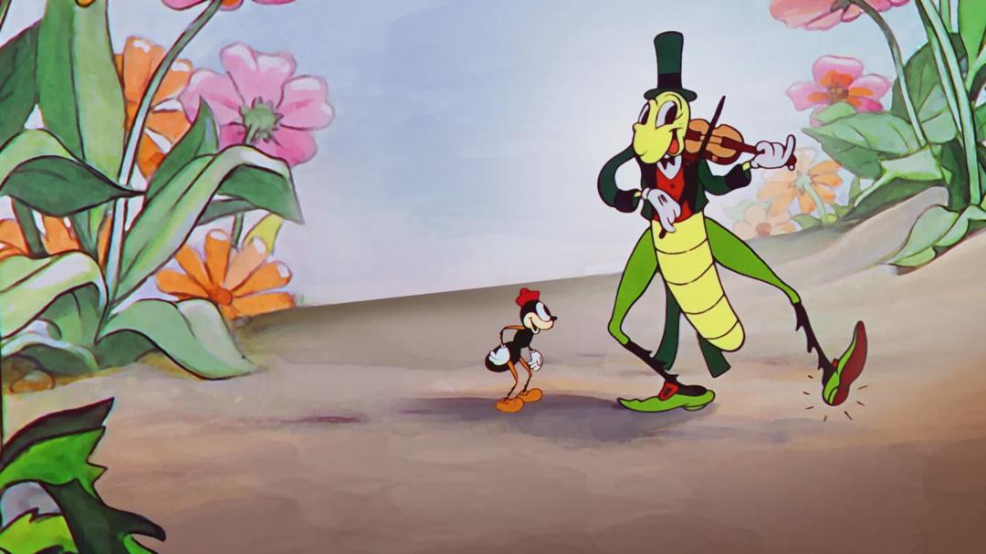 As in the classic fable, the grasshopper plays his fiddle and lives for the moment, while the industrious ants squirrel away massive amounts of food for the winter. With his song, he's able to convince at least one small ant until the queen arrives and scares him back to work. The queen warns the grasshopper of the trouble he'll be in, come winter. Winter comes, and the grasshopper, near starvation, stumbles across the ants, who are having a full-on feast in their snug little tree. They take him in and warm him up. The queen tells him only those who work can eat so he must play for them. Written by Jon Reeves