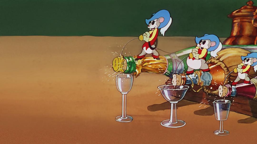 As the title implies, the three blind mice are musketeers. The cat sets a number of traps for them, which they all evade (apparently without realizing it) while he sleeps. The cat eventually wakes up and begins chasing them unsuccessfully, thanks to their teamwork.